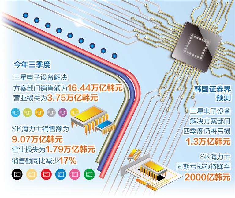 如此大幅度的价格变化同样也反映在三星电子和SK海力士的业绩报表中。三季度业绩报告显示,三星电子负责半导体业务的设备解决方案(DS)部门销售额为16.44万亿韩元,营业损失为3.75万亿韩元,大部分亏损都发生在存储半导体业务上。SK海力士第三季度的销售额为9.07万亿韩元,营业损失为1.79万亿韩元,与去年同期相比,销售额减少了17%,利润也是由正转负。