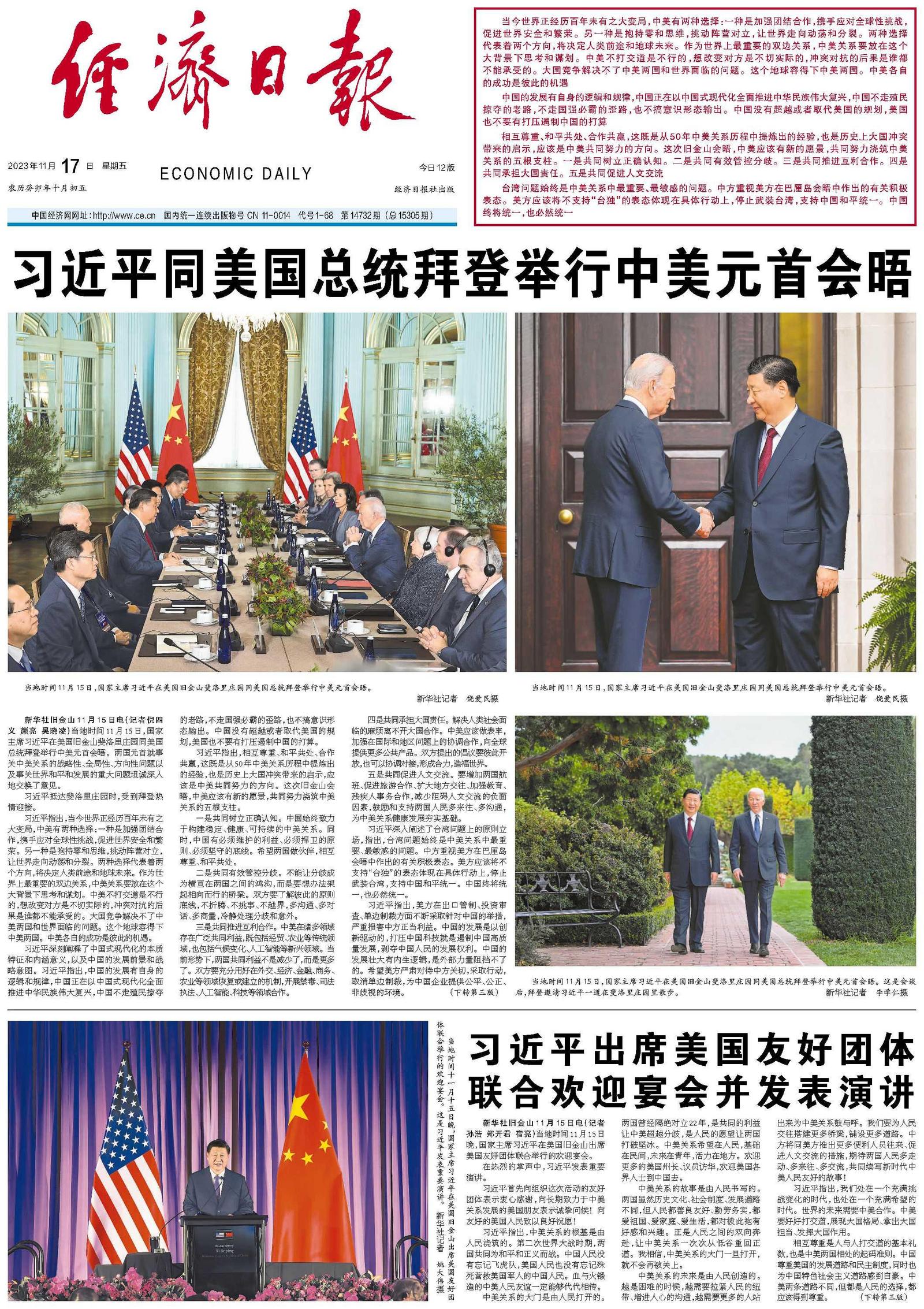 这次会晤积极、全面、富有建设性,为改善和发展中美关系指明了方向。旧金山应该成为稳定中美关系的新起点。两国元首责成双方团队在落实好巴厘岛会晤共识基础上,及时跟进和落实本次会晤达成的新愿景。两国元首同意继续保持经常性联系。