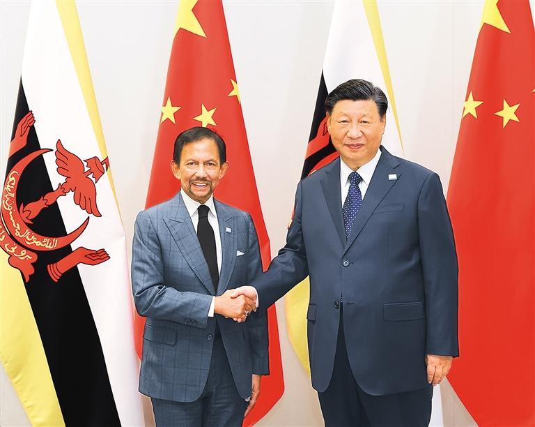 习近平指出,中国和文莱是隔海相望的友好邻邦,也是相互信任、相互支持的好伙伴。建交30多年来,两国不断深化政治互信,积极对接发展战略,各领域务实合作取得丰硕成果,在国际和地区事务中保持良好配合,树立了大小国家平等相待、互利共赢的典范,为地区和平稳定和发展繁荣作出了积极贡献。今年是中文建立战略合作伙伴关系5周年。中方愿同文莱一道,高质量共建“一带一路”,推动双边关系不断得到新发展,为两国人民带来更多福祉。