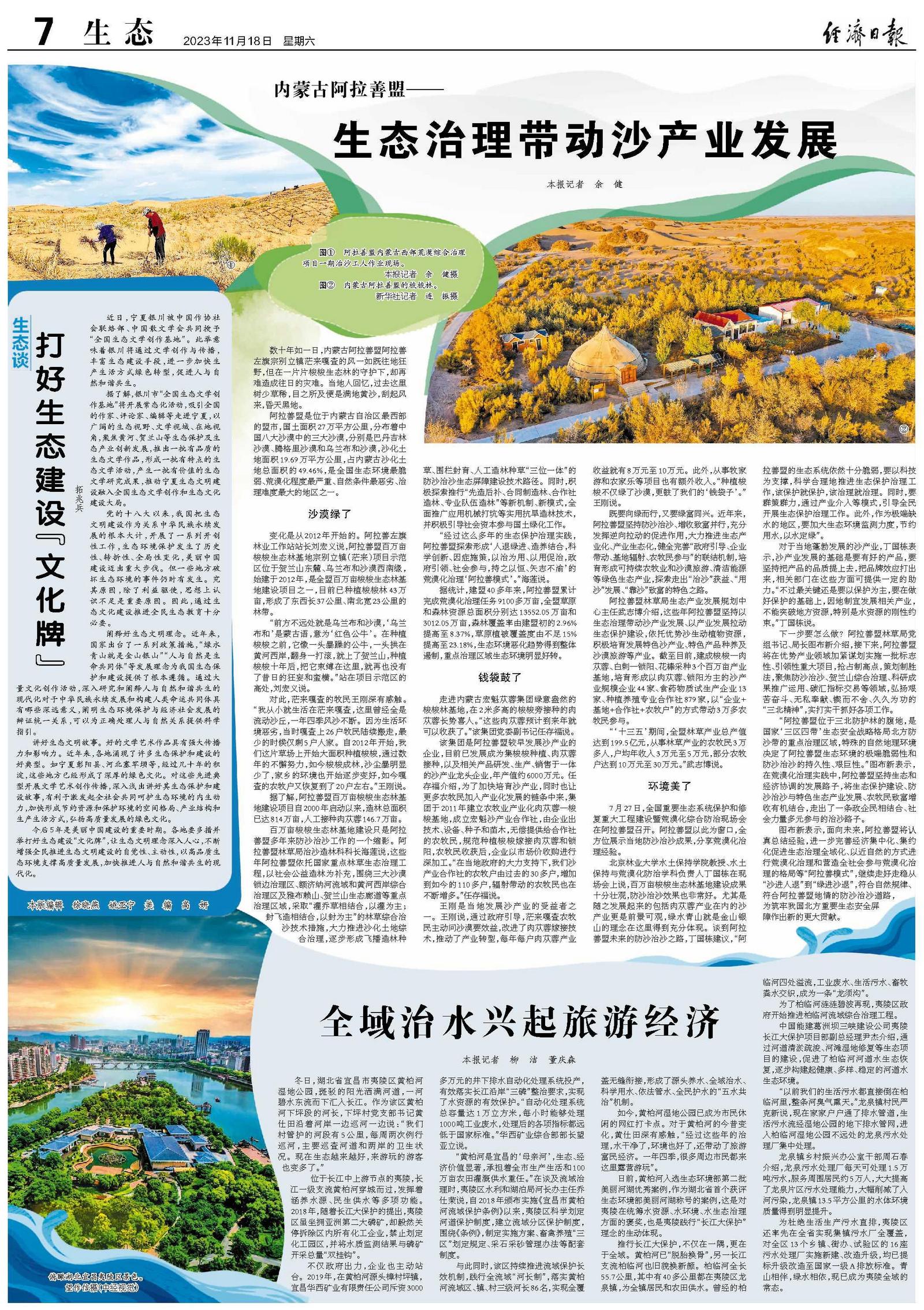 既要向绿而行,又要绿富同兴。近年来,阿拉善盟坚持防沙治沙、增收致富并行,充分发挥逆向拉动的促进作用,大力推进生态产业化、产业生态化,健全完善“政府引导、企业带动、基地辐射、农牧民参与”的联结机制,培育形成可持续农牧业和沙漠旅游、清洁能源等绿色生态产业,探索走出“治沙”获益、“用沙”发展、“靠沙”致富的特色之路。