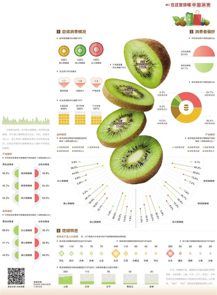 目前,线上平台已成为猕猴桃销售的重要渠道。数据显示,来自河北、四川的消费者买走了更多贵州猕猴桃,来自北京、江苏的消费者买走了更多陕西猕猴桃,来自重庆、上海的消费者买走了更多四川猕猴桃。