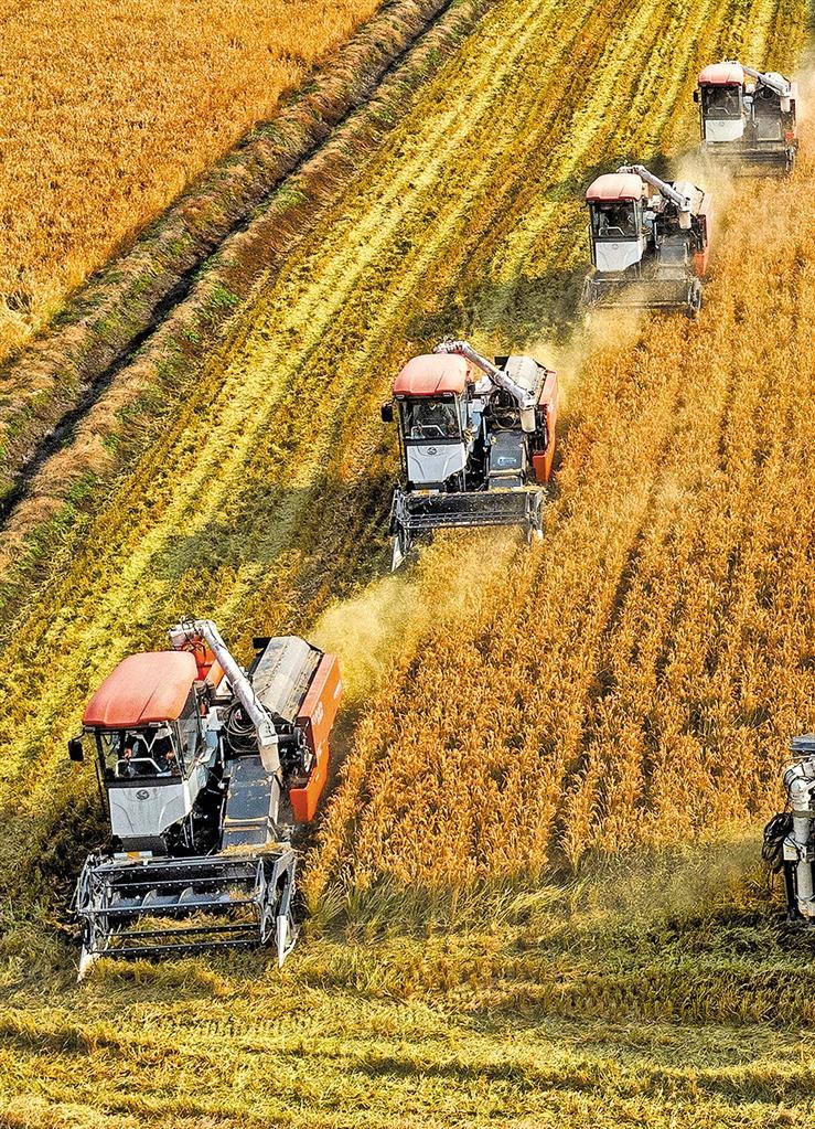 11月16日,江苏省连云港市东海县平明镇安营村,县农发集团所属的高效农田项目区内,大型联合收割机正在紧张收获晚稻。邵光明摄(中经视觉)