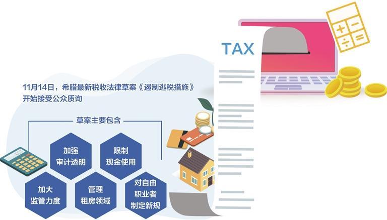 11月14日,希腊最新税收法律草案《遏制逃税措施》开始接受公众质询,其中有些条款涵盖许多不同层面的干预措施,其目的是通过改革税收制度,切实解决让希腊政府无比头痛的逃税问题,并在未来将改革成果惠及公民生活。