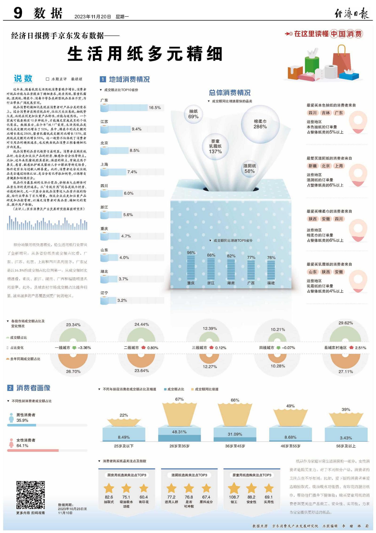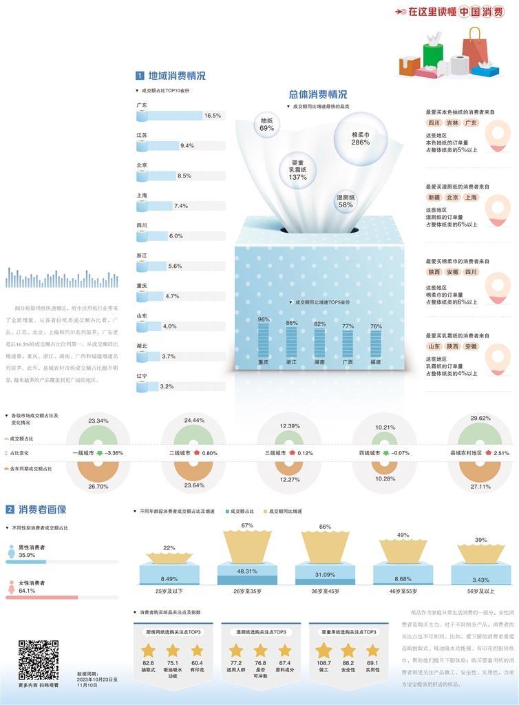 纸品消费的精细化表现在消费者对产品分类的需求上。过去消费者在购买纸品时,往往只关注卷纸、抽纸等大类,而现在则更加注重产品特性、功能与适用性。一个家庭可能要购买10多种纸巾,才能满足家庭成员的个性化需求。数据显示,在今年“双11”首周,生活用纸品类的总成交额同比增长了52%。其中,棉柔巾的成交额同比增长高达286%,婴童乳霜纸成交额同比增长137%,湿厕纸成交额同比增长58%。这一趋势不仅体现了消费者对日用品的精致追求,也反映出纸品消费正朝着精细化方向发展。