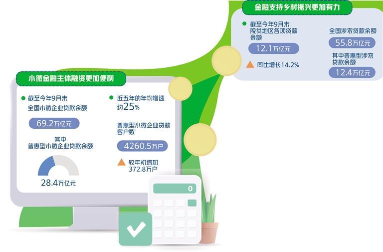 报告中提到的一系列数据反映出过去10年普惠金融的发展成效。报告显示,基础金融服务更加普及。10年来,银行机构聚焦大众金融、线上线下同步发力,目前全国银行机构网点覆盖97.9%的乡镇。小微金融主体融资更加便利。截至今年9月末,全国小微企业贷款余额69.2万亿元,其中普惠型小微企业贷款余额28.4万亿元。近五年的年均增速约25%,普惠型小微企业贷款客户数4260.5万户,较年初增加372.8万户,金融支持乡村振兴更加有力。截至9月末,脱贫地区各项贷款余额12.1万亿元,同比增长14.2%,全国涉农贷款余额55.8万亿元,其中普惠型涉农贷款余额12.4万亿元,较年初增长18.58%。