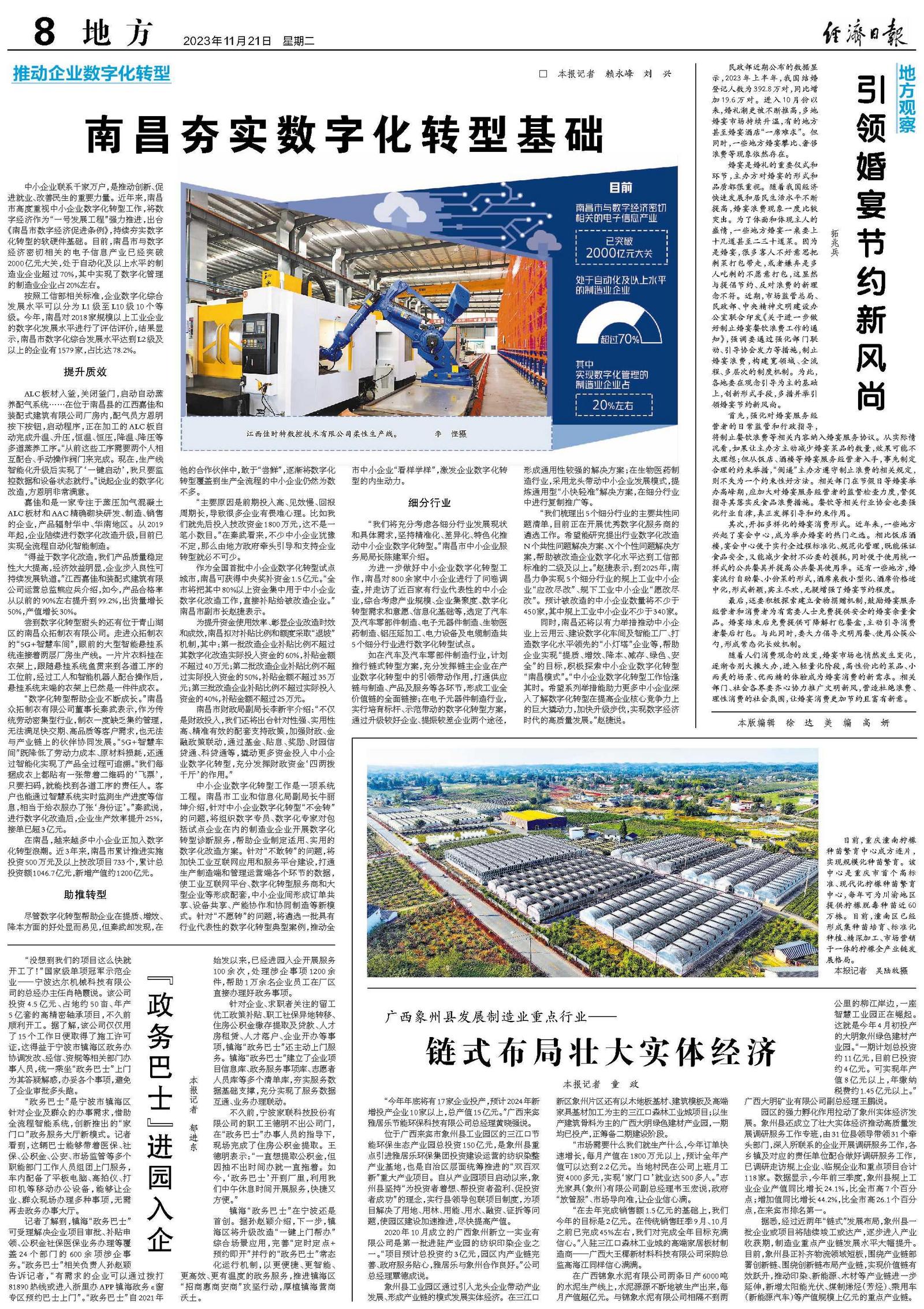 同时,南昌还将以有力举措推动中小企业上云用云、建设数字化车间及智能工厂、打造数字化水平领先的“小灯塔”企业等,帮助企业实现“提质、增效、降本、减存、绿色、安全”的目标,积极探索中小企业数字化转型“南昌模式”。“中小企业数字化转型工作恰逢其时。希望系列举措能助力更多中小企业深入了解数字化转型在提高企业核心竞争力上的巨大撬动力,加快升级步伐,实现数字经济时代的高质量发展。”赵捷说。
