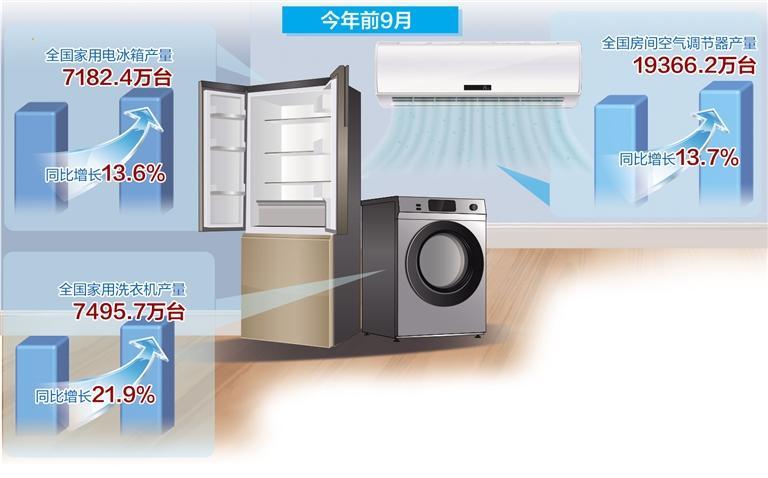 今年以来,我国白色家电生产增势明显。国家统计局数据显示,前9月,全国家用电冰箱产量7182.4万台,同比增长13.6%;房间空气调节器产量19366.2万台,同比增长13.7%;家用洗衣机产量7495.7万台,同比增长21.9%。