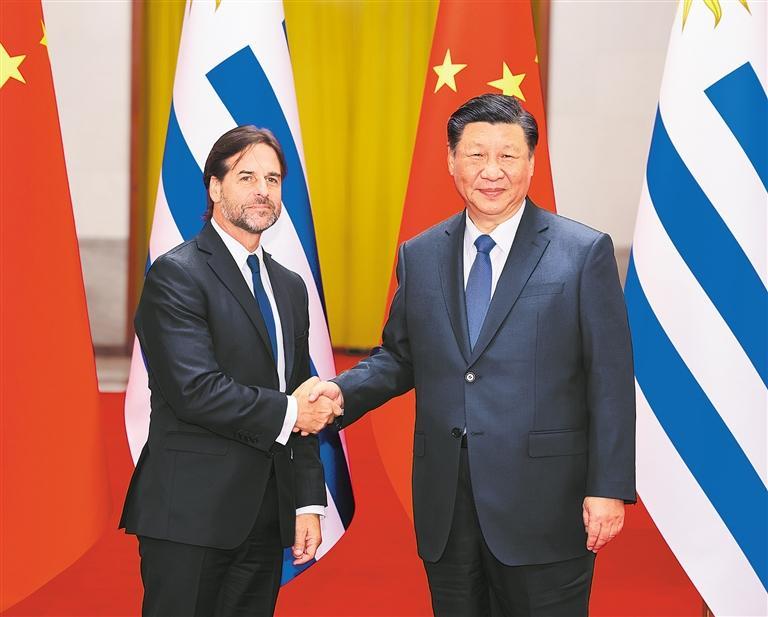 习近平指出,2023年是中乌建交35周年和乌拉圭加入共建“一带一路”倡议5周年。建交35年来,两国始终坚持相互尊重、平等相待、合作共赢,各领域交流合作蓬勃发展。特别是面对新冠疫情,两国守望相助、同心抗疫,中乌战略伙伴关系得到升华。中方愿同乌方一道,以建立全面战略伙伴关系为新起点、新坐标,提升双边关系水平,丰富两国合作内涵,将中乌关系打造成为不同体量、不同制度、不同文化国家团结合作的典范,更好服务各自国家发展,增进两国人民福祉。