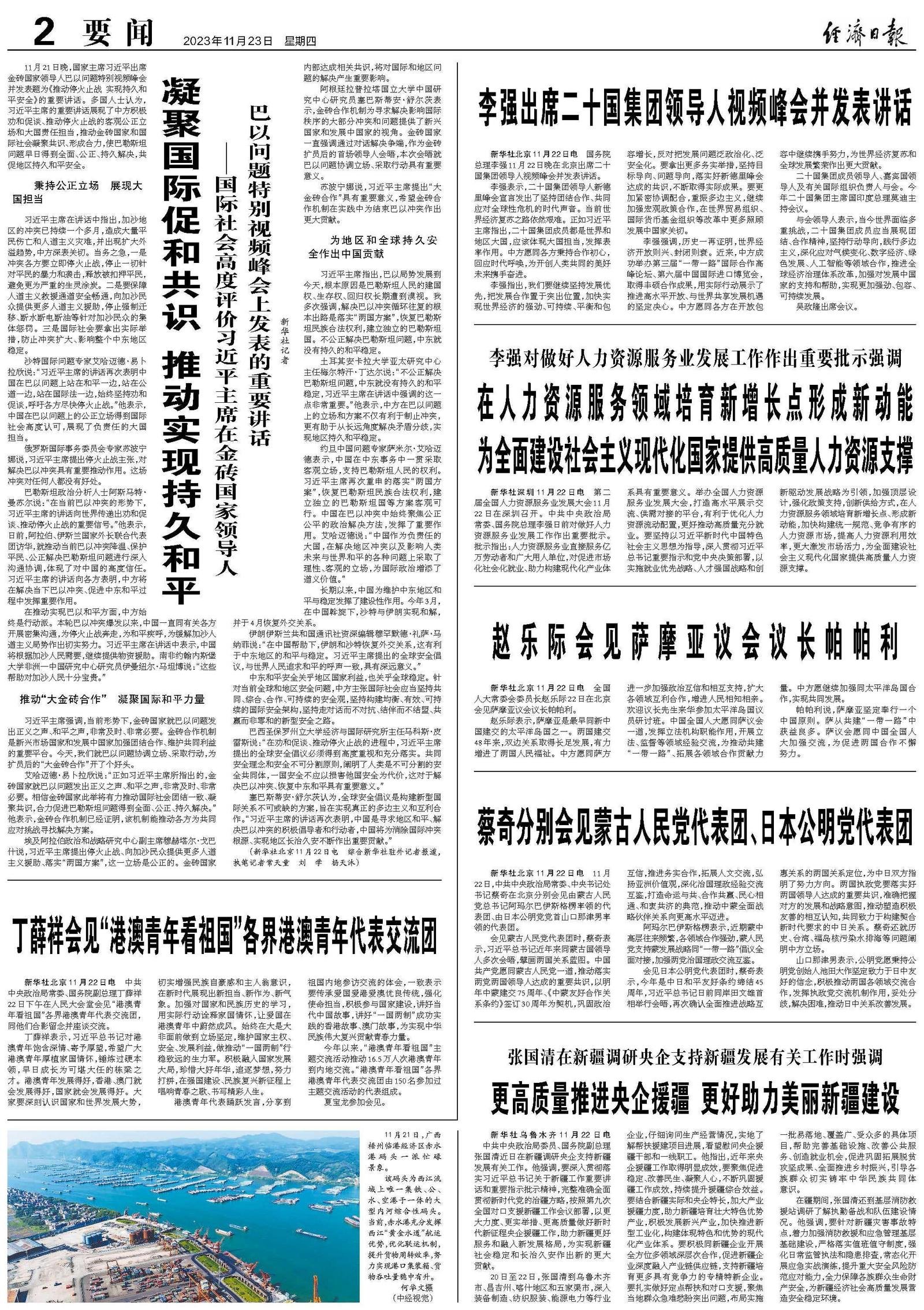 11月21日晚,国家主席习近平出席金砖国家领导人巴以问题特别视频峰会并发表题为《推动停火止战 实现持久和平安全》的重要讲话。多国人士认为,习近平主席的重要讲话展现了中方积极劝和促谈、推动停火止战的客观公正立场和大国责任担当,推动金砖国家和国际社会凝聚共识、形成合力,使巴勒斯坦问题早日得到全面、公正、持久解决,共促地区持久和平安全。