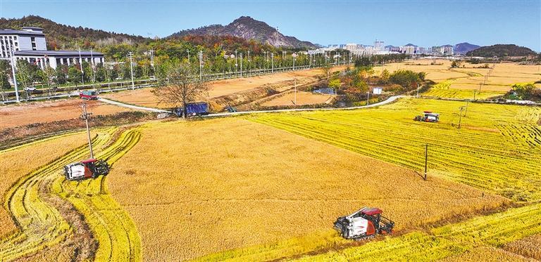 11月24日,安徽省芜湖市繁昌区峨山镇凤形村,村民正在稻田进行机械化收割。