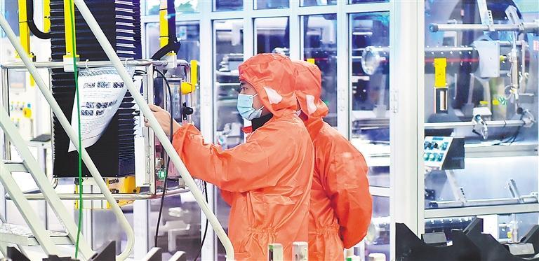 11月24日,在江西鹰潭高新区一家新能源科技公司生产车间,技术工人在生产线上作业。