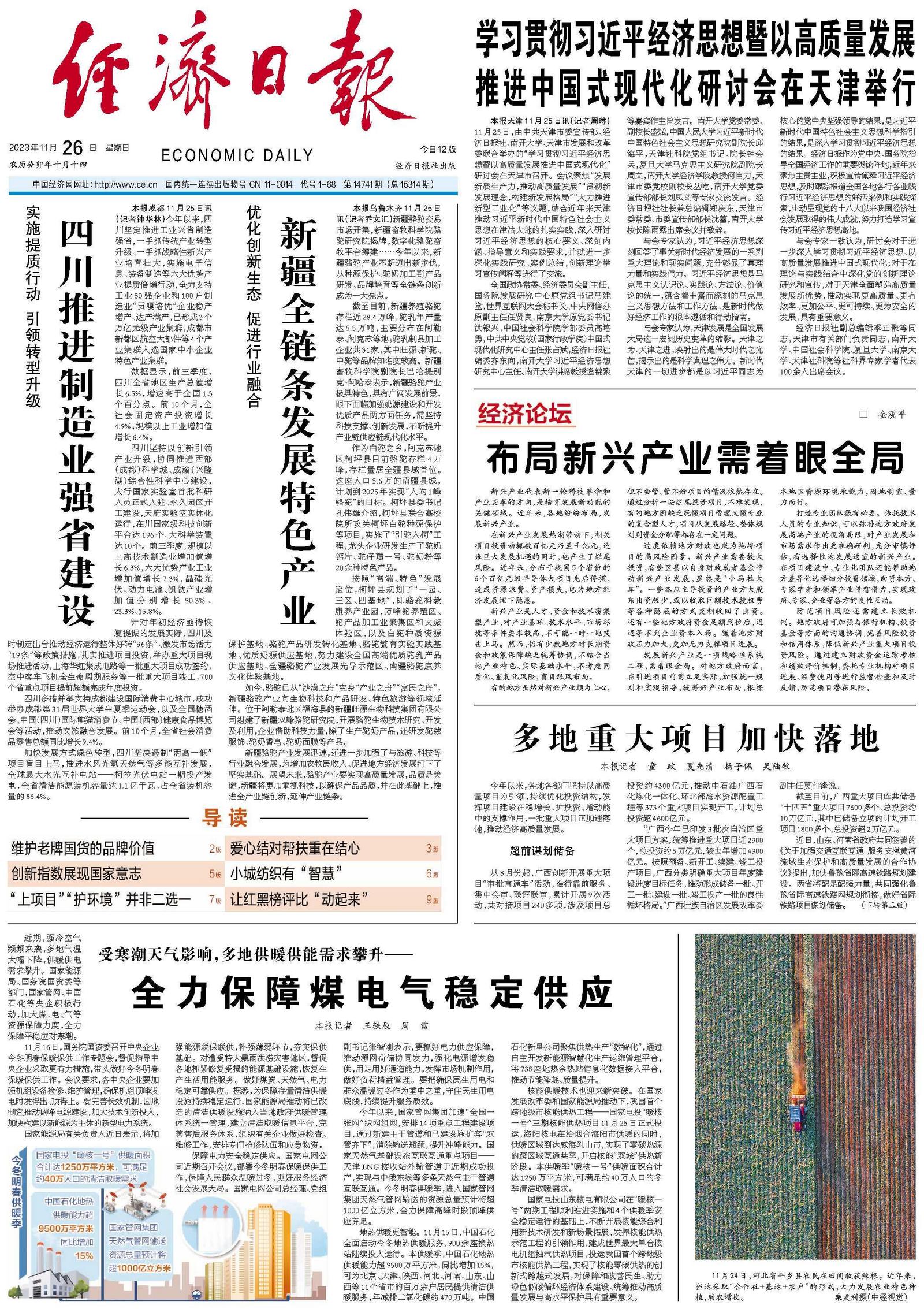 四川坚持以创新引领产业升级,协同推进西部(成都)科学城、成渝(兴隆湖)综合性科学中心建设,太行国家实验室首批科研人员正式入驻、永久园区开工建设,天府实验室实体化运行,在川国家级科技创新平台达196个、大科学装置达10个。前三季度,规模以上高技术制造业增加值增长6.3%,六大优势产业工业增加值增长7.3%,晶硅光伏、动力电池、钒钛产业增加值分别增长50.3%、23.3%、15.8%。
