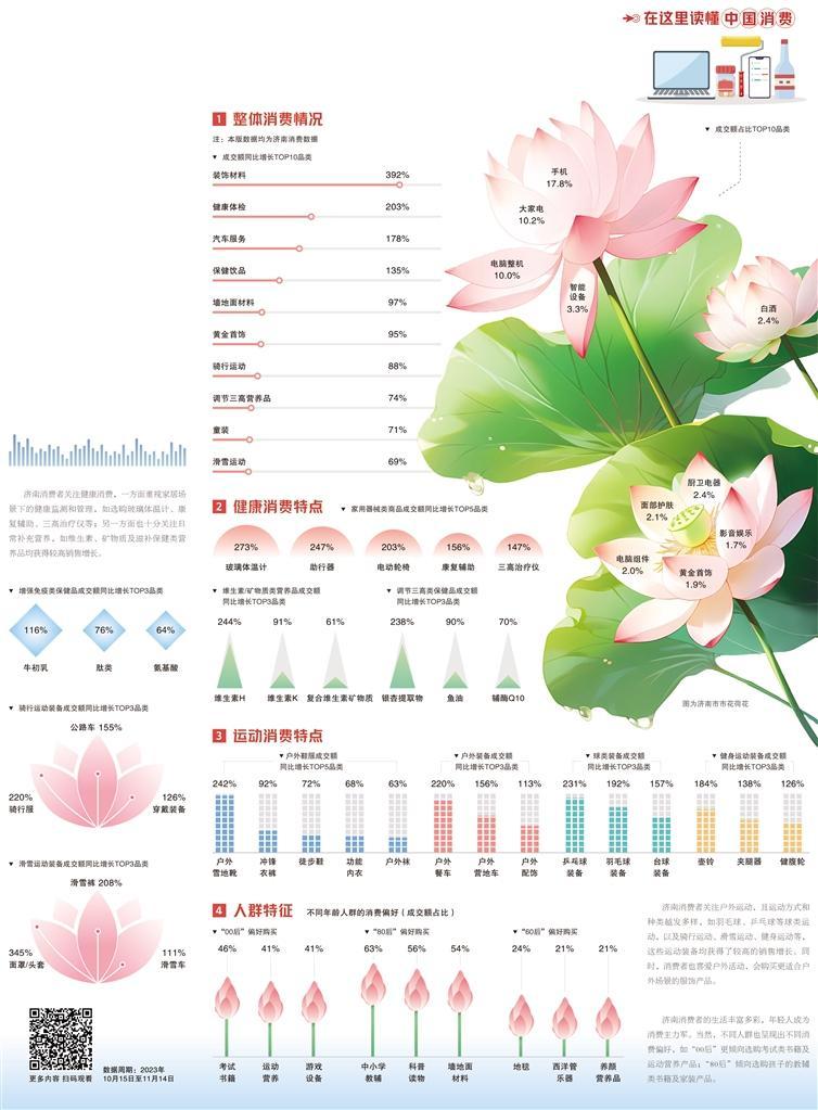 从消费偏好上看,济南市消费者更加关注品质消费、智能消费和健康消费。数据显示,济南市在家装家居、汽车消费、电子产品及保健体检等领域消费增长较快,消费理念呈现迭代升级趋势。其中,成交额占比前三名的品类分别是手机、大家电、电脑整机。济南市消费者更偏好于户外运动,滑雪、徒步、骑行等既能挑战自我又能贴近自然的运动方式颇受青睐。户外雪地靴、冲锋衣裤、徒步鞋成交额同比增长了242%、92%、72%。