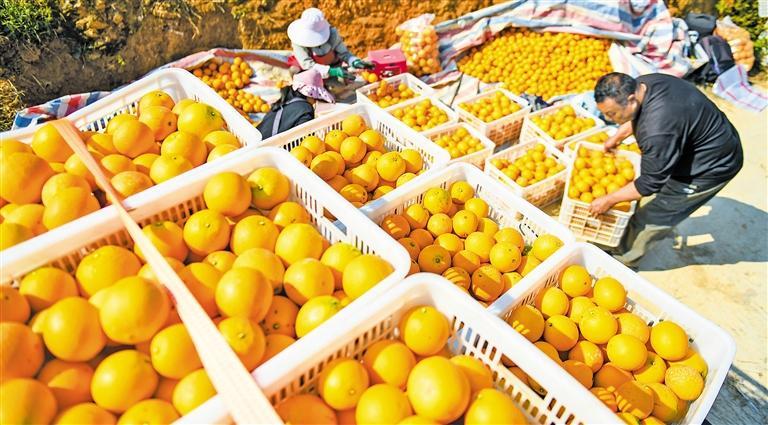 11月27日,在贵州省黔西南布依族苗族自治州晴隆县鸡场镇学官社区脐橙种植基地,果农正将采摘的脐橙装车。近年来,当地立足自然资源禀赋,采取“公司+合作社+基地+农户”的组织方式,把脐橙产业作为发展山地特色高效农业产业,助力果农增产增收。 刘朝富摄 (中经视觉)