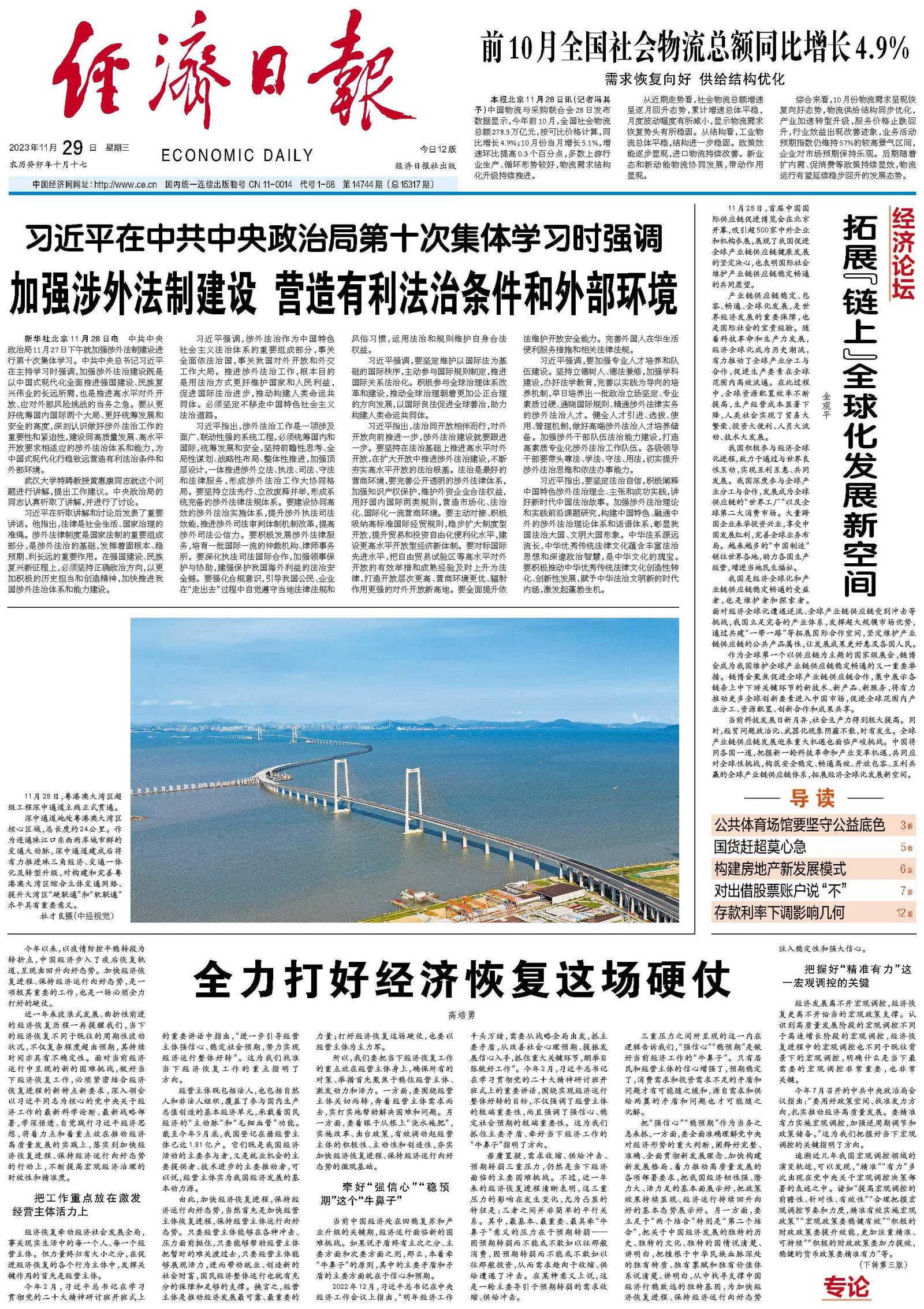 新华社北京11月28日电 中共中央政治局11月27日下午就加强涉外法制建设进行第十次集体学习。中共中央总书记习近平在主持学习时强调,加强涉外法治建设既是以中国式现代化全面推进强国建设、民族复兴伟业的长远所需,也是推进高水平对外开放、应对外部风险挑战的当务之急。要从更好统筹国内国际两个大局、更好统筹发展和安全的高度,深刻认识做好涉外法治工作的重要性和紧迫性,建设同高质量发展、高水平开放要求相适应的涉外法治体系和能力,为中国式现代化行稳致远营造有利法治条件和外部环境。