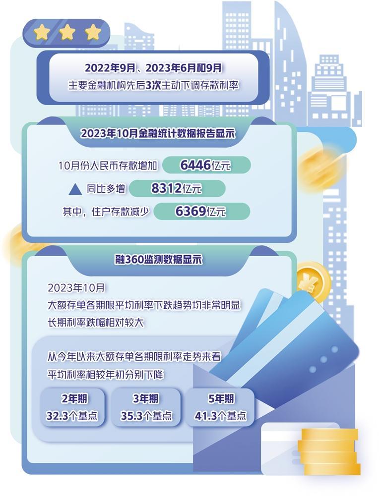 2022年9月、2023年6月和9月,主要金融机构先后3次主动下调存款利率,中长期定期存款利率下调幅度更大,存款利率市场化程度显著提升。