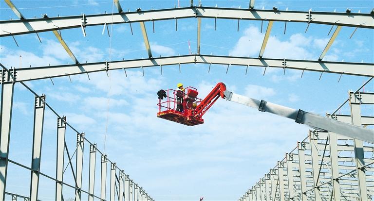 11月29日,湖南省永州市新田县产业开发区鲁丽绿色新材料科技产业园工地内,工人正进行厂房建设高空作业。该项目建成后,将形成集原木加工、板材生产、再生能源利用等于一体的全产业链体系。刘贵雄摄(中经视觉)