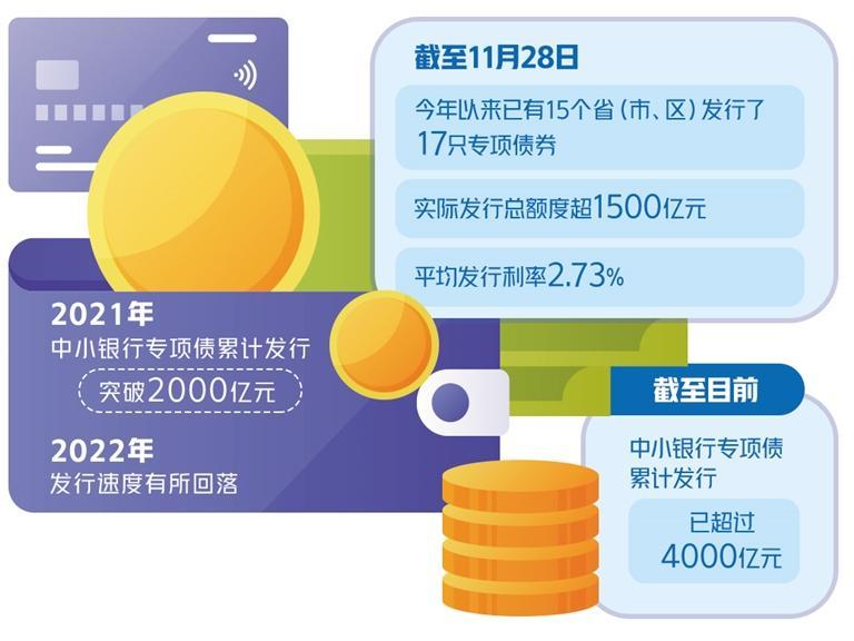 2020年7月,中央允许地方政府专项债合理支持中小银行补充资本金,开辟了中小银行资本补充的新渠道。同年12月,支持中小银行专项债发行。2021年,中小银行专项债累计发行突破2000亿元,2022年发行速度有所回落。今年以来,专项债发行再次提速,截至11月28日,已有15个省(市、区)发行了17只专项债券,实际发行总额度超1500亿元,为去年全年630亿元实际发行总额的两倍多,平均发行利率2.73%。中小银行专项债累计发行已超过4000亿元。