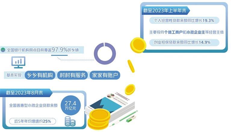 近年来,我国民生领域金融服务覆盖率、可得性逐步提高。国家金融监管总局的数据显示,目前全国银行机构网点覆盖97.9%的乡镇,基本实现乡乡有机构、村村有服务、家家有账户;全国乡镇基本实现保险服务全覆盖。截至2023年8月末,全国普惠型小微企业贷款余额27.4万亿元,近5年年均增速约25%。