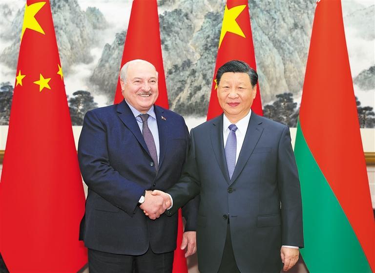 习近平强调,十年前我提出共建“一带一路”倡议,现在已有150多个国家参与合作。不久前,我提出中国支持高质量共建“一带一路”的八项行动,欢迎白方继续积极参与,从中获得更多实实在在的发展机遇。双方要实施好中白工业园等项目,推动中白工业合作取得更多成果。双方要提高跨境运输便利化水平,促进经贸和人员往来。定期互办文化日活动,扩大教育、卫生、体育、旅游合作,支持两国青年开展交流合作,增进两国人民相互了解和友谊。中白双方是参与全球治理体系改革和建设的重要力量。中方愿同白方加强在联合国、上海合作组织等多边机制内协调和配合,推动落实全球发展倡议、全球安全倡议、全球文明倡议,推动构建人类命运共同体。