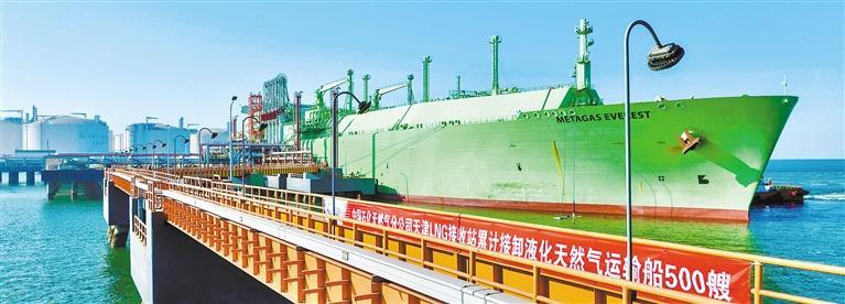 12月3日,“麦加”号液化天然气运输船靠泊天津LNG(液化天然气)接收站2号泊位,这是该站接卸的第500船液化天然气。自2018年投产至今,该站已累计接卸进口液化天然气3300万吨,有力保障了我国能源供应。 王 军摄 (中经视觉)