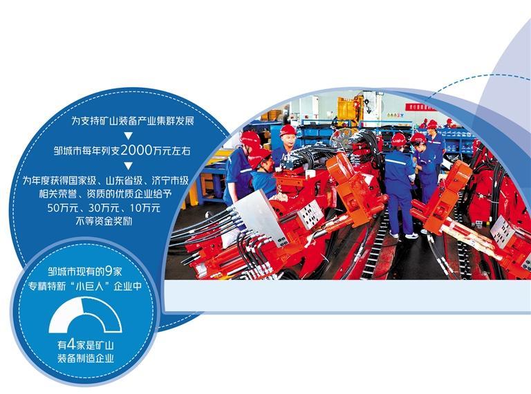 为支持矿山装备产业集群发展,邹城市出台扶持性政策,每年列支2000万元左右,为年度获得国家级、山东省级、济宁市级相关荣誉、资质的优质企业给予50万元、30万元、10万元不等资金奖励,表彰突出贡献企业家。聘任营商环境特约观察员10名,设立营商环境监测点168个,接受社会监督,维护企业合法权益。邹城市现有的9家专精特新“小巨人”企业中,有4家是矿山装备制造企业。
