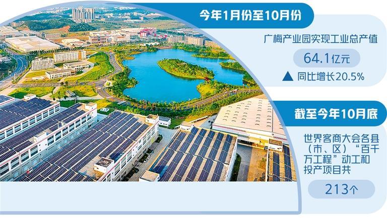 作为梅州承接广州产业转移的主要园区,广梅产业园正积极抢抓融湾先行区建设和省推动产业梯度转移的机遇,通过引进一个项目带动一个产业,合力引进一批国内外知名企业。10年间,广梅产业园已蝶变成为一座产业新城。今年1月份至10月份,广梅产业园实现工业总产值64.1亿元,同比增长20.5%。