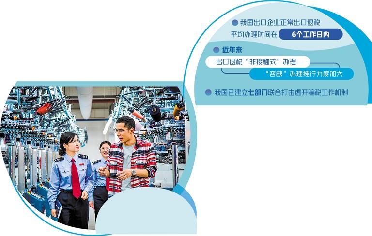 多位受访人士回忆,10年前,办理出口退税的时间至少在半个月以上,有时可能需要1个月。如今,我国出口企业正常出口退税平均办理时间在6个工作日内。同时,我国将办理一类、二类出口企业正常出口退(免)税的平均时间压缩在3个工作日内的政策延续实施至2024年底。