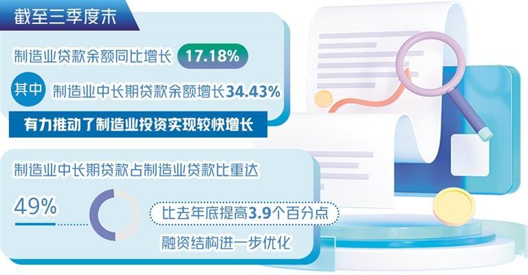 推动金融机构加大对制造业支持已成为金融工作重点。统计数据显示,今年以来制造业贷款结构持续优化。截至三季度末,制造业贷款余额同比增长17.18%,其中,制造业中长期贷款余额增长34.43%,有力推动了制造业投资实现较快增长;同时,制造业中长期贷款占制造业贷款比重达49%,比去年底提高3.9个百分点,融资结构进一步优化。