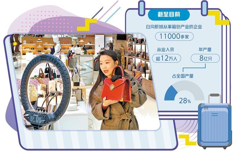 金雪飞告诉记者,为了让白沟箱包产业由中低端走向中高端,近年来,白沟新城管委会按照“增品种、提品质、创品牌”的“数字三品”战略要求,通过搭建白沟箱包数字化转型公共服务平台、成立箱包产业工业设计中心、设计创新中心等举措,为箱包产业转型升级赋能。截至目前,已组织16家规模以上企业设立设计中心(机构),引入彩虹设计网,建设星河工坊工业设计服务平台,并与中央美术学院等院校合作,积极扩大优质设计资源对接供给,发放财政奖励资金830万元,先后推出箱包设计新版型1000余款,其中新品种销量能占到总销量的五成,开发注册商标达10162个,在全域形成了以自有知识产权占绝对优势的产业集群。