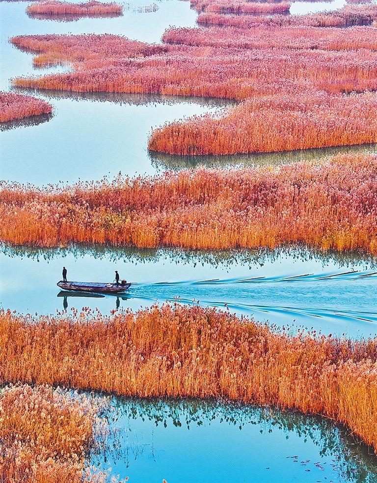 十二月九日,江苏省泗洪县半城镇的志愿者乘船在洪泽湖水域穿行。近年来,当地累计完成退渔还湿面积超二十六万亩,为鸟类营造良好栖息环境。方东旭摄(中经视觉)