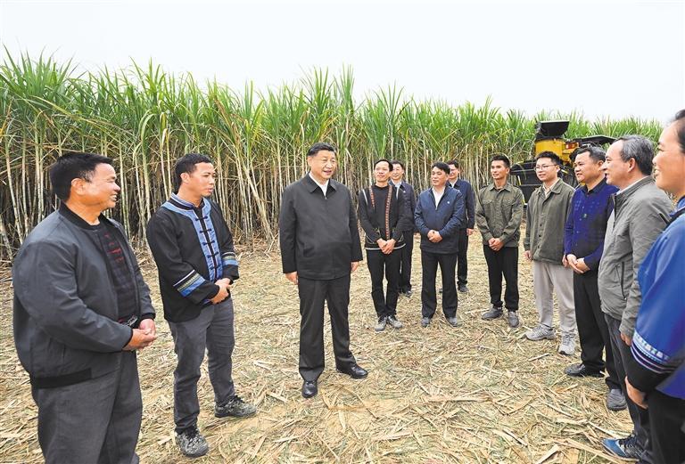 14日下午,习近平到来宾市考察调研。在国家现代农业产业园黄安优质“双高”糖料蔗基地,习近平察看万亩甘蔗林和机械化作业收割场景,听取基地情况介绍。他走进甘蔗林,详细了解甘蔗良种繁育技术要领,同蔗农、农机手和农技人员亲切交流。习近平指出,广西是我国蔗糖主产区,要把这一特色优势产业做强做大,为保障国家糖业安全、促进蔗农增收致富发挥更大作用。要积极培育和推广良种、提高机械化作业水平,建设好现代农业产业园。要探索建立更加稳定的利益联结机制,让广大农民共享农村改革和发展成果。他祝愿乡亲们的生活像甘蔗一样甜蜜。