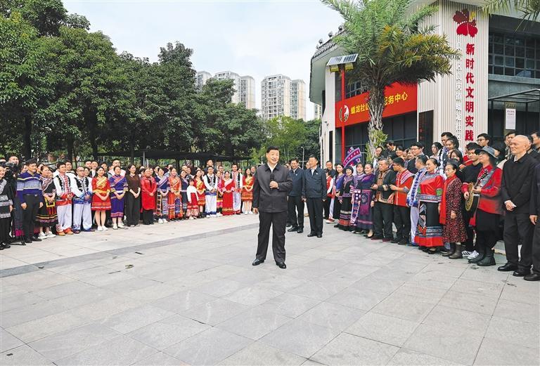 离开社区时,各族群众热情欢送总书记。习近平亲切地对大家说,我昨天结束对越南的国事访问,直接来广西考察调研。构建具有战略意义的中越命运共同体,将更有利于广西的开放发展,壮美广西前景光明。广西作为我国少数民族人口最多的自治区,各族人民同顶一片天、同耕一垌田、同饮一江水、同建一家园。全面建设社会主义现代化国家,一个民族都不能少。希望社区各族群众多来往,大家互帮互助,交知心朋友,做和睦邻居,共同建设幸福家园。