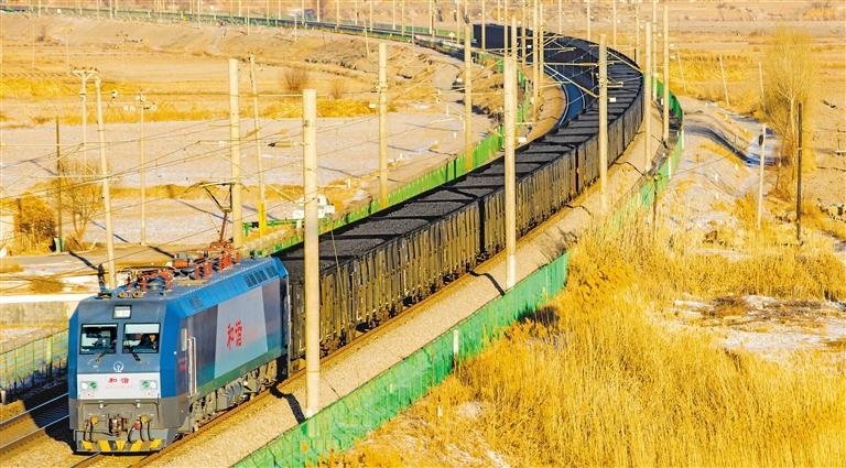 12月16日,在甘肃省张掖市兰新铁路线上,满载煤炭的列车驶过。全国多地近日迎来大范围降雪寒潮天气,兰新铁路部门发挥运输主渠道作用,对电暖用煤实行优先运输,全力保障用煤需求。杨 潇摄(中经视觉)