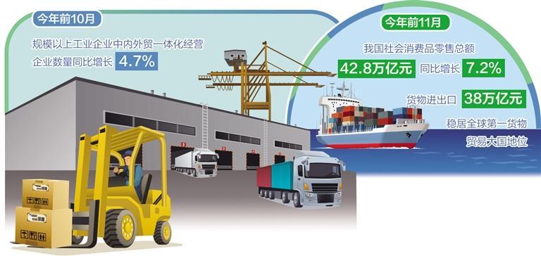 加快内外贸一体化是构建新发展格局、推动高质量发展的内在要求。今年前11个月,我国社会消费品零售总额42.8万亿元,同比增长7.2%;货物进出口38万亿元,同比持平,稳居全球第二大消费市场和全球第一货物贸易大国地位。同时,内外贸规则制度进一步衔接,国际标准转化率超过80%,企业内外贸一体化发展意愿进一步增强,今年前10个月,规模以上工业企业中内外贸一体化经营企业数量同比增长4.7%。
