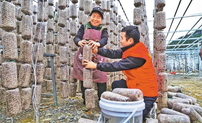 近日,湖南湘西凤凰县青年党员志愿者在帮助农户整理黑木耳菌棒。今年以来,凤凰组织新时代文明实践志愿服务队深入农村一线,开展志愿服务助农活动,助推全域文明创建。石丹丹摄