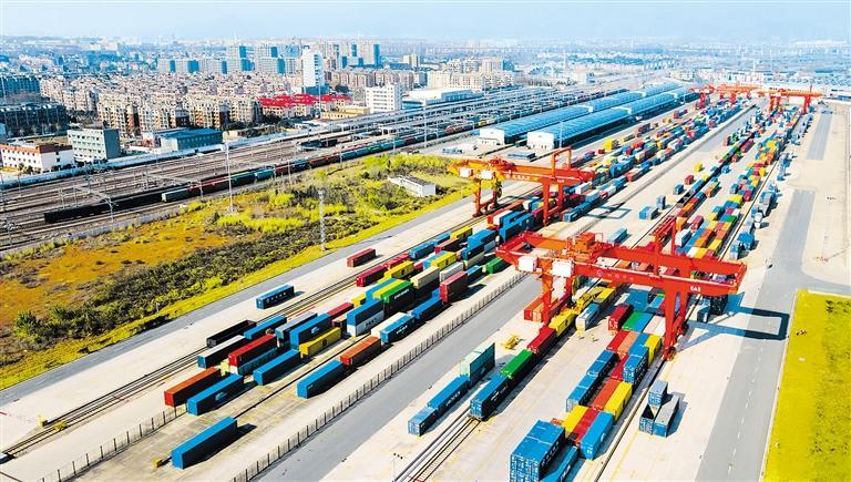 12月22日,浙江省金华市华东国际联运港铁路金华南站海关监管作业场,集装箱货物整装待发。今年以来,杭州海关累计监管中欧班列(金华)进出口集装箱已突破18.8万标箱,超去年全年总量。胡肖飞摄(中经视觉)