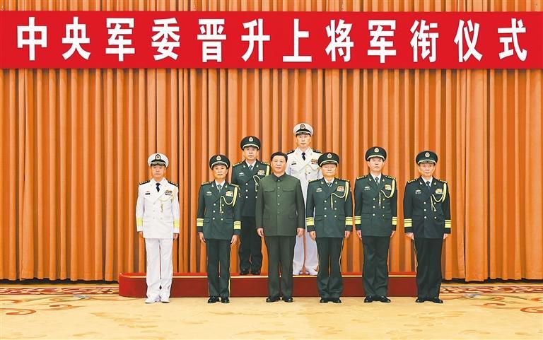 晋衔仪式在嘹亮的军歌声中结束。随后,习近平等领导同志同晋升上将军衔的军官合影。