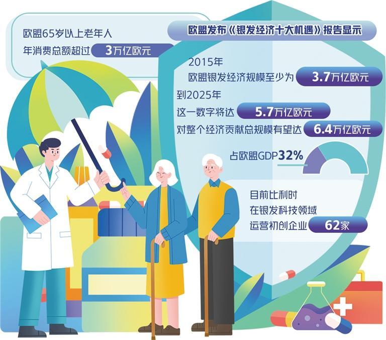 老龄化社会既是挑战也是商机。根据2019年欧盟发布的《银发经济十大机遇》报告,目前欧盟65岁以上老年人年消费总额超过3万亿欧元。2015年,欧盟银发经济规模至少为3.7万亿欧元。到2025年,这一数字将达5.7万亿欧元,对整个经济贡献的总规模有望达到6.4万亿欧元,占欧盟GDP的32%。在住房、服务、老年用品等领域将创造8800万个就业岗位,占欧盟就业总人数的38%。