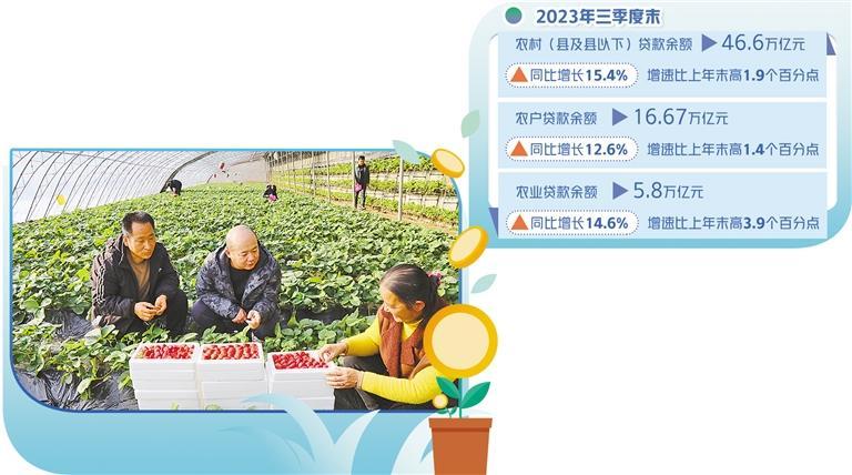 中国人民银行数据显示,2023年三季度末,农村(县及县以下)贷款余额46.6万亿元,同比增长15.4%,增速比上年末高1.9个百分点;前三季度增加5.66万亿元,同比多增1.28万亿元。农户贷款余额16.67万亿元,同比增长12.6%,增速比上年末高1.4个百分点;前三季度增加1.69万亿元,同比多增3061亿元。农业贷款余额5.8万亿元,同比增长14.6%,增速比上年末高3.9个百分点;前三季度增加7112亿元,同比多增2077亿元。