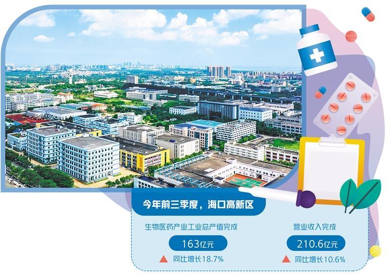 今年前10个月,海口高新区生物医药产业新建21个项目,续建11个项目,投资完成18.4亿元,完成年度投资的105%。前三季度,当地生物医药产业工业总产值完成163亿元,同比增长18.7%;营业收入完成210.6亿元,同比增长10.6%。