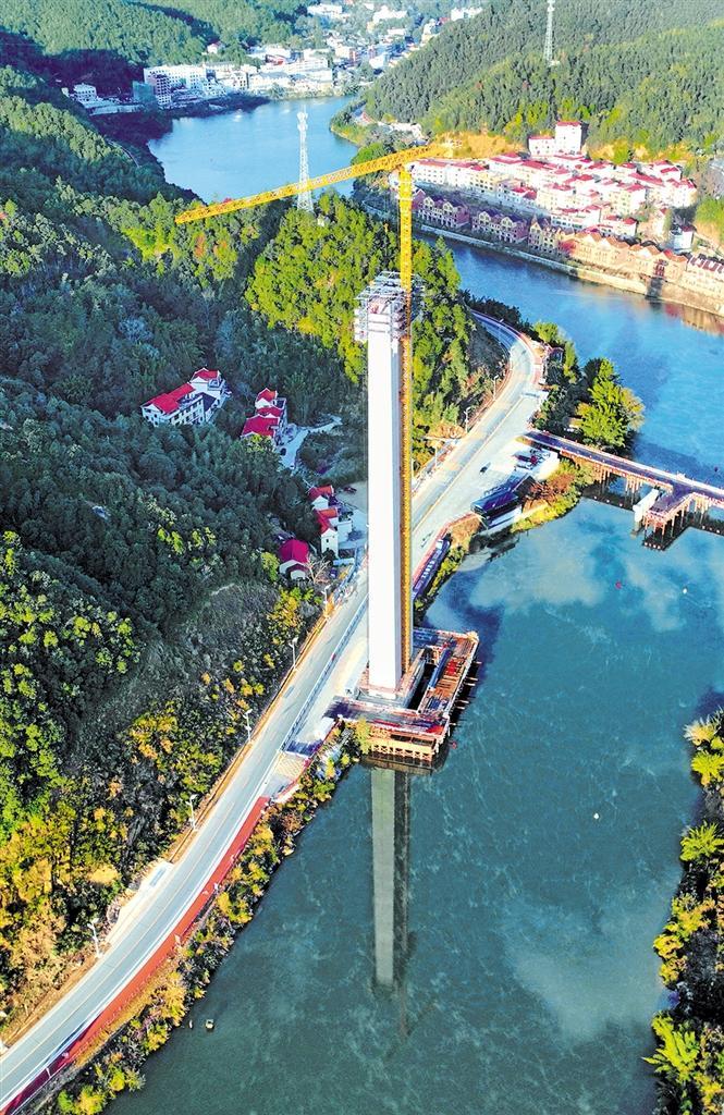 12月30日,江西在建桥梁第一高墩——上犹江特大桥主墩顺利封顶,桥墩高达126米。上犹江特大桥是遂大高速全线控制性和重难点工程,全长1419米,共7联24跨。李建平摄(中经视觉)
