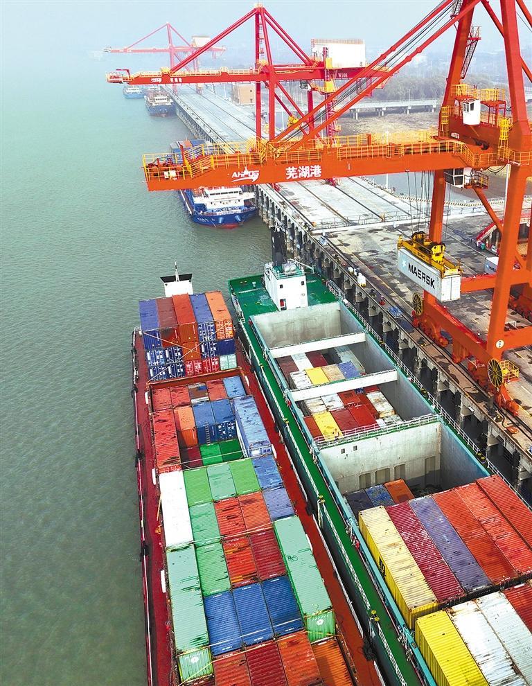 12月30日,安徽港口集团芜湖港朱家桥港区国际集装箱码头一派繁忙景象。截至12月29日,芜湖港全年集装箱吞吐量实现140万标箱的历史性突破,同比增长12%。王玉实摄(中经视觉)