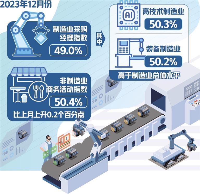 2023年12月31日,国家统计局服务业调查中心、中国物流与采购联合会发布的中国采购经理指数(PMI)显示,2023年12月份,制造业采购经理指数为49.0%,比上月下降0.4个百分点;非制造业商务活动指数为50.4%,比上月上升0.2个百分点;综合PMI产出指数为50.3%,比上月微落0.1个百分点。国家统计局服务业调查中心高级统计师赵庆河表示,我国经济总体产出景气水平保持稳定。