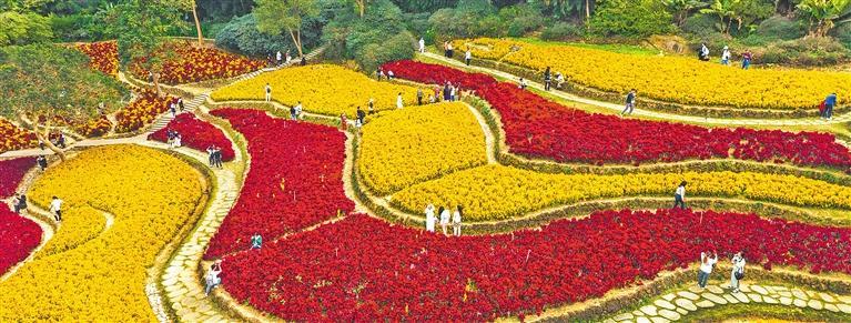 2023年12月31日,广西南宁市青秀山风景区兰园绚兰花田的穗冠花灿烂盛放,吸引了许多游客前来打卡拍照。近年来,南宁市积极推进生态园林城市建设,形成了独具特色的城市风貌。