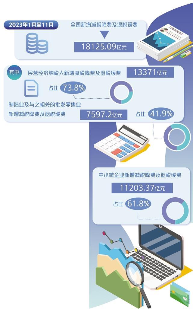国家税务总局最新数据显示,2023年1月至11月,全国新增减税降费及退税缓费18125.09亿元。其中,民营经济纳税人新增减税降费及退税缓费13371亿元,占比73.8%。中小微企业受益最明显,新增减税降费及退税缓费11203.37亿元,占比61.8%。