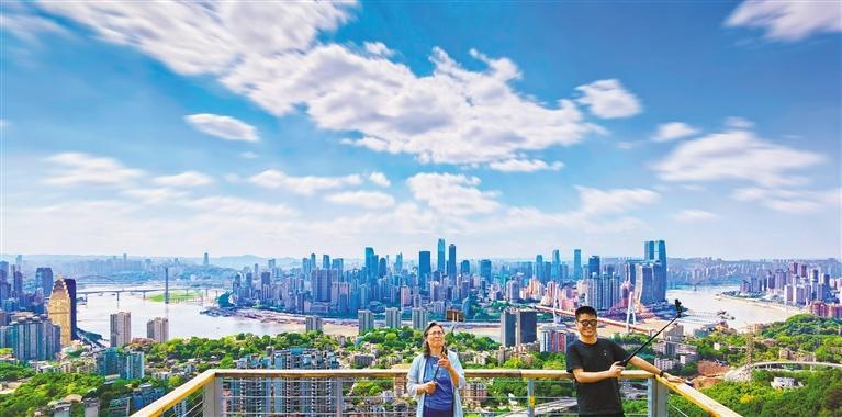 ▲游客在南岸区一棵树观景台打卡渝中半岛美景。重庆加快推动两江四岸整体提升,山水之城、美丽之地的独特魅力不断彰显。