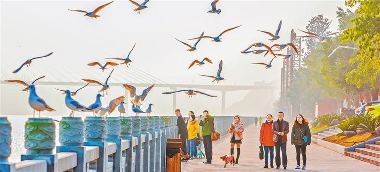 ◀重庆丰都县长江边,红嘴鸥飞舞嬉戏,引来众多游客驻足观赏。近年来,该县加大生态保护力度,自然环境得到有效改善,每年冬季都有大量红嘴鸥来此越冬。