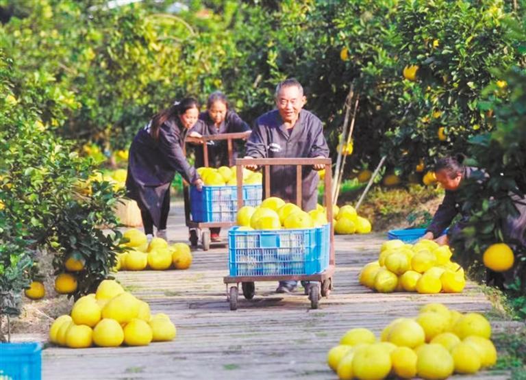 ◀重庆梁平区种植的柚子喜获丰收。该区把柚子产业作为乡村振兴的特色产业来抓,2023年柚子产量约30万吨,全产业链综合产值近50亿元。