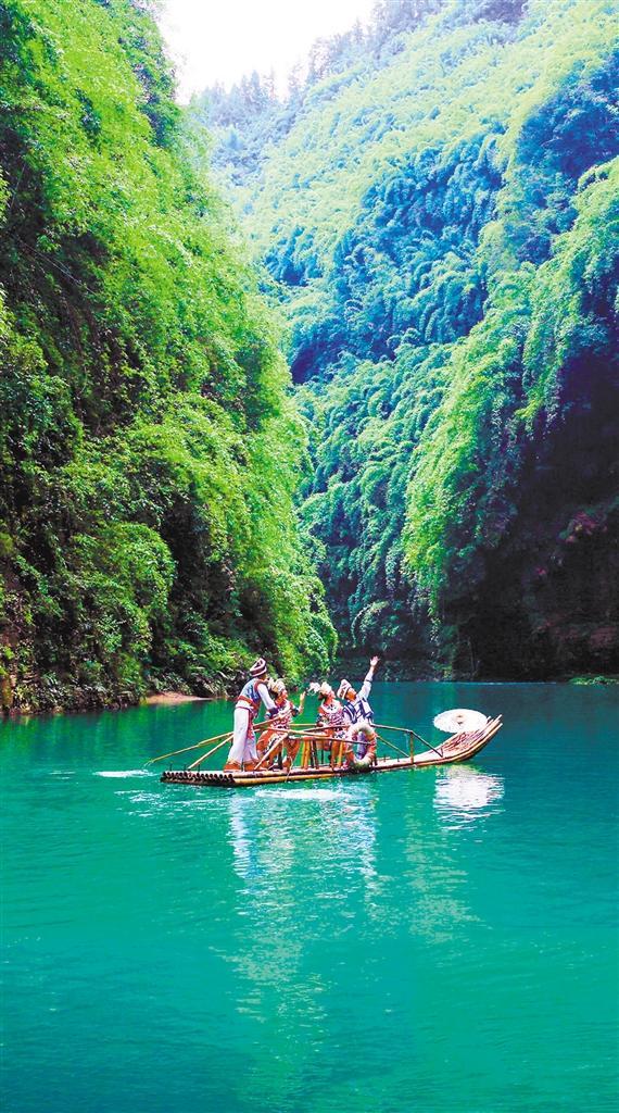 ◀游客乘坐竹筏在彭水苗族土家族自治县阿依河上游玩。当地在不断加强阿依河生态环境保护的同时,大力发展生态旅游,促进生态效益与经济效益双丰收。赵 勇摄(中经视觉)